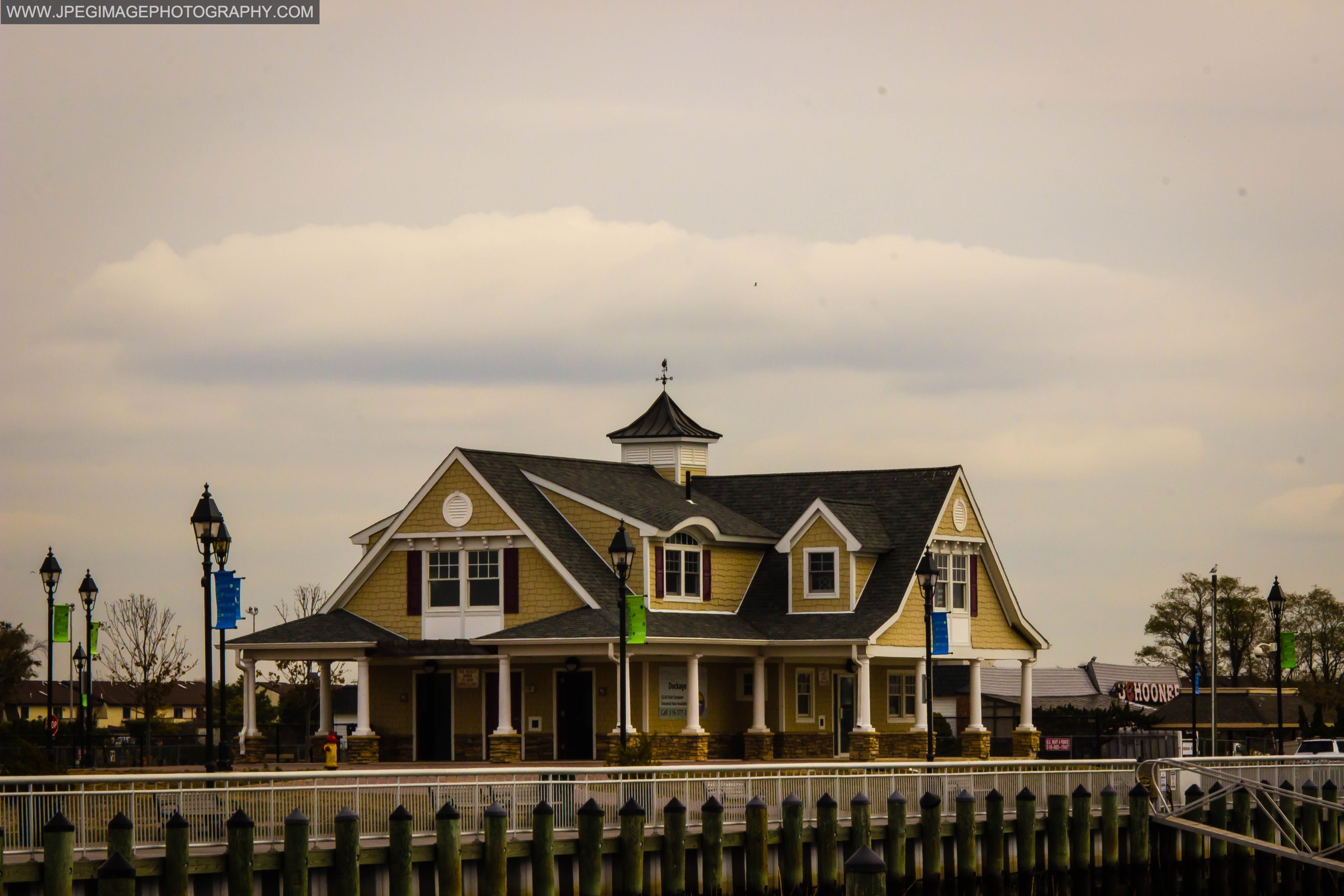 Pier with view of local street located at Woodcleft fishing station at Nautical Mile in Freeport L.I.