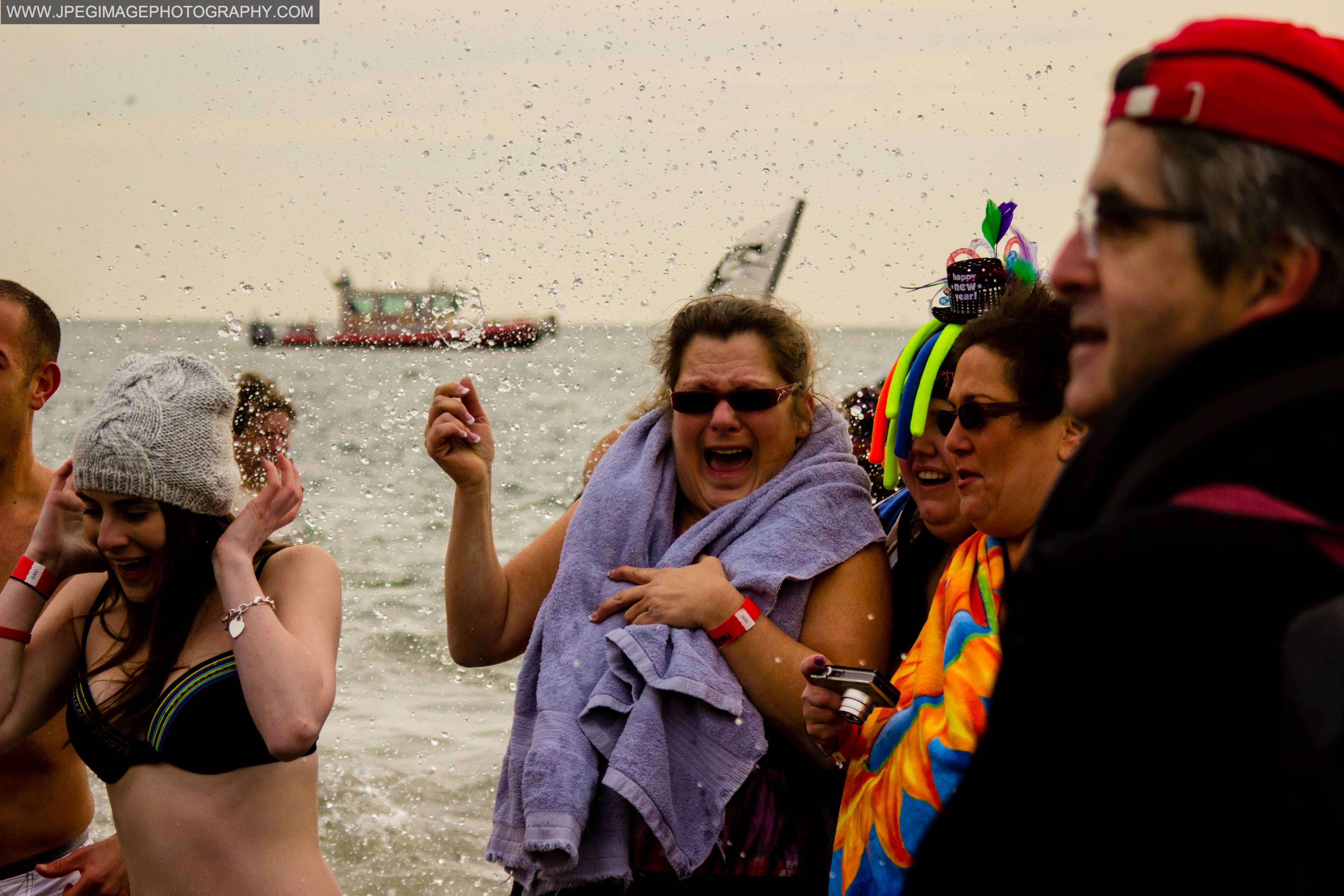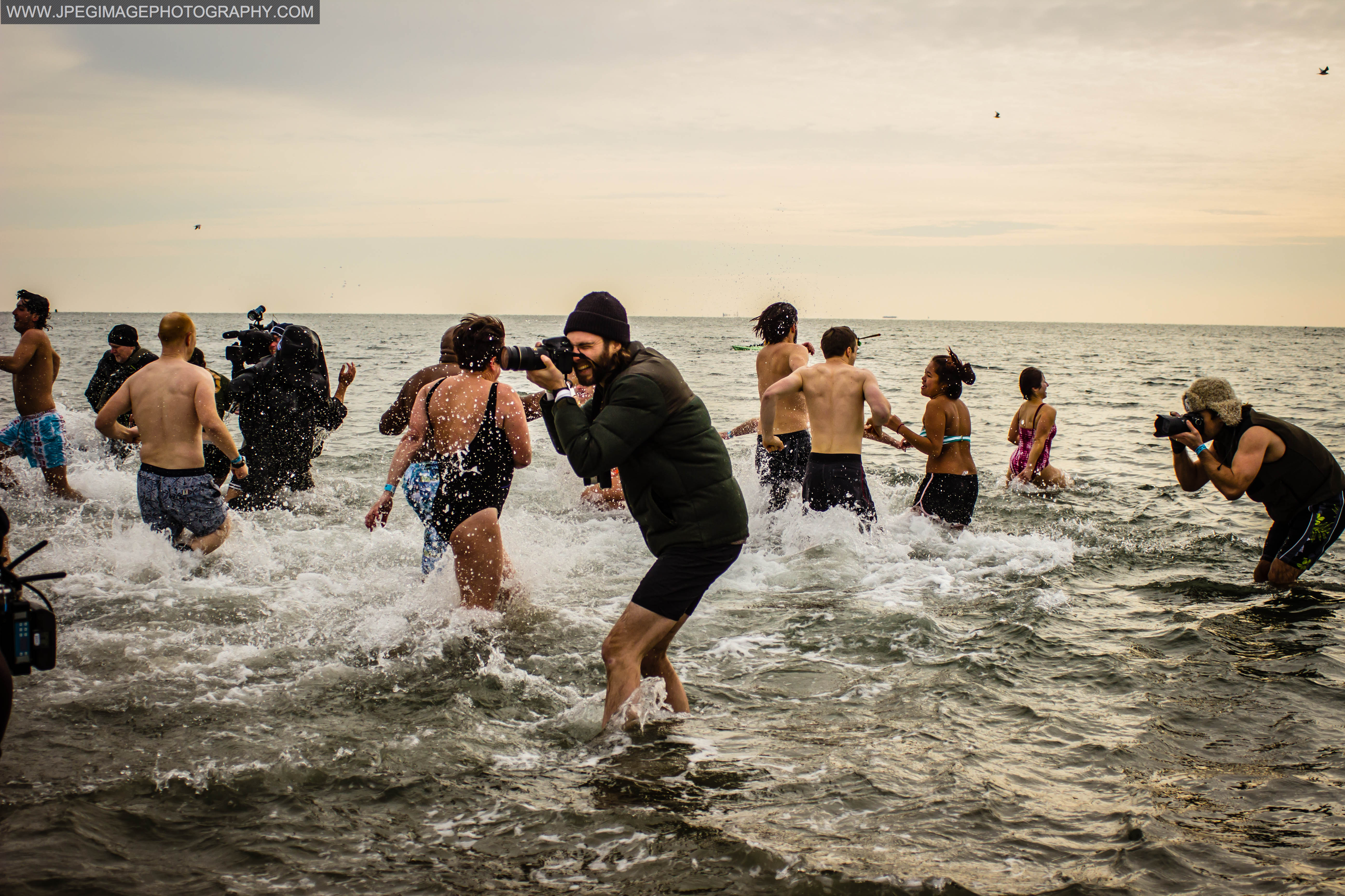 After spending some time within the crowds of all the people. It was time to go onto the beach to get some shots of the people that were going in. Then like clockwork a large horn blew at exactly one o’clock in the afternoon and they went running in. The first wave/group just charged into they icy waters of the Atlantic Ocean. At first I tried to stay away from the water and not get wet. But after a few “bad shots,” I had to go into the water knee-deep like some of the other photographers in order to get a few good shots.