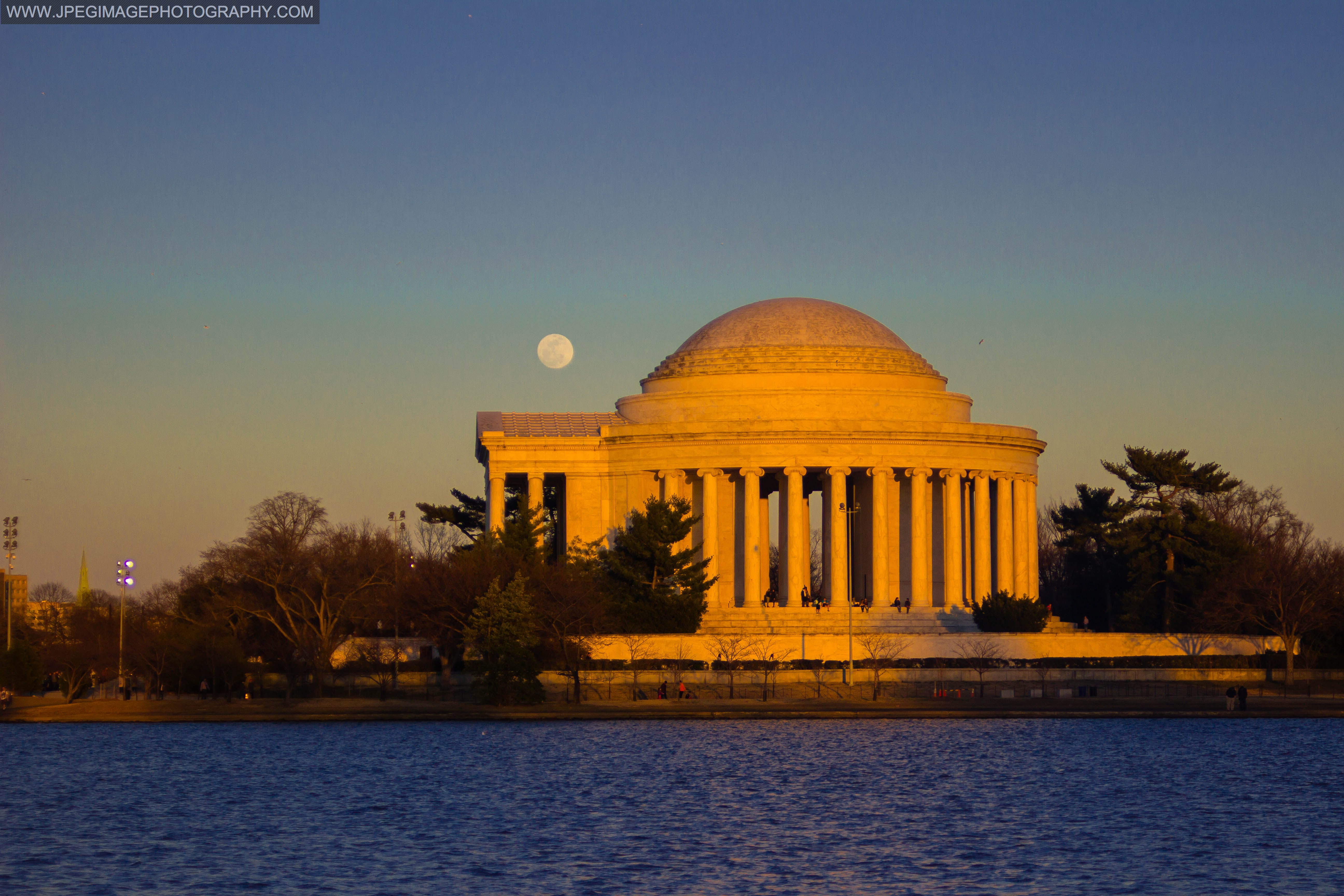 It was the Jefferson Memorial that was to be one of my final photos for the day. For I had noticed the memorial had such a great color to it from the effects of golden hour. Plus the slight mix of blue and gold in the sky and the deep blue of the water, just made for a great shot I thought. Plus the full moon that was rising above was also a good addition as well to the photograph.
