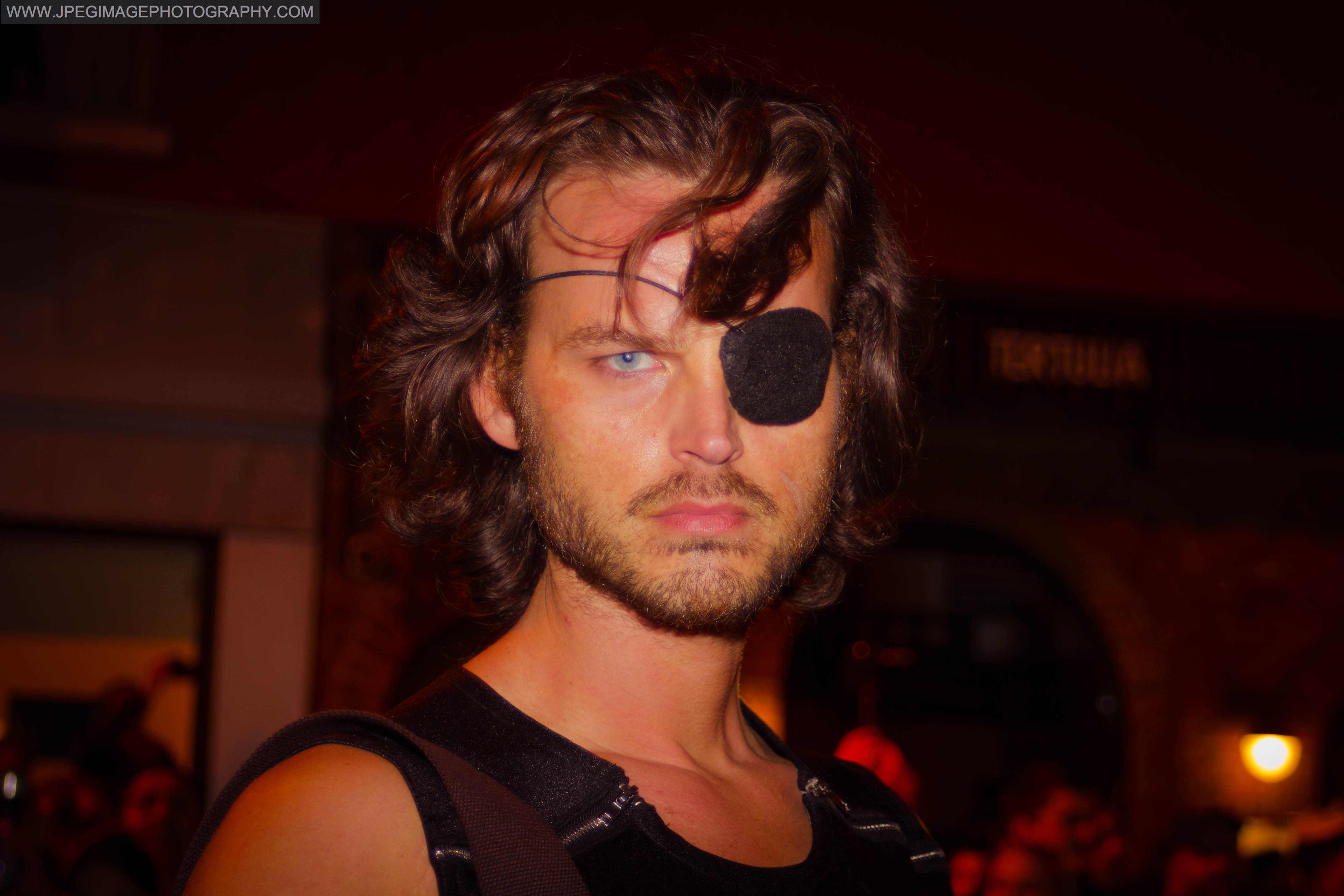 Portrait of a random male dressed as fictional character Snake Plissken during the New York City Halloween parade.